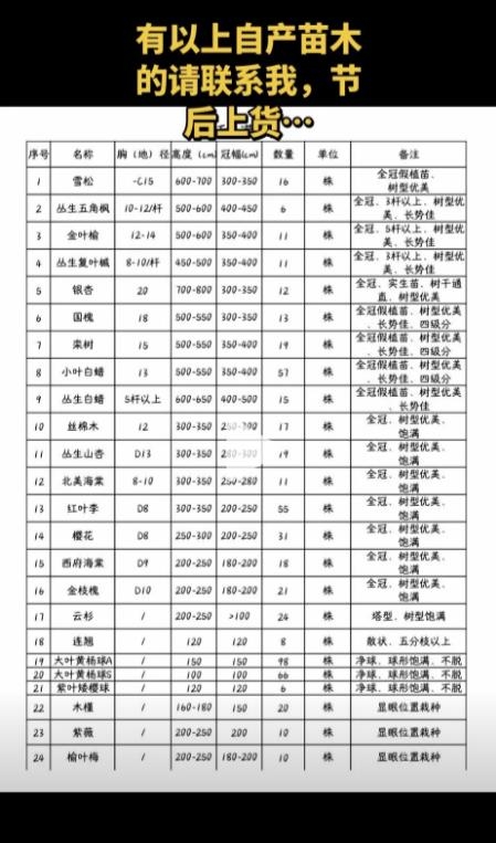 求购以下苗木,按照清单要求报价